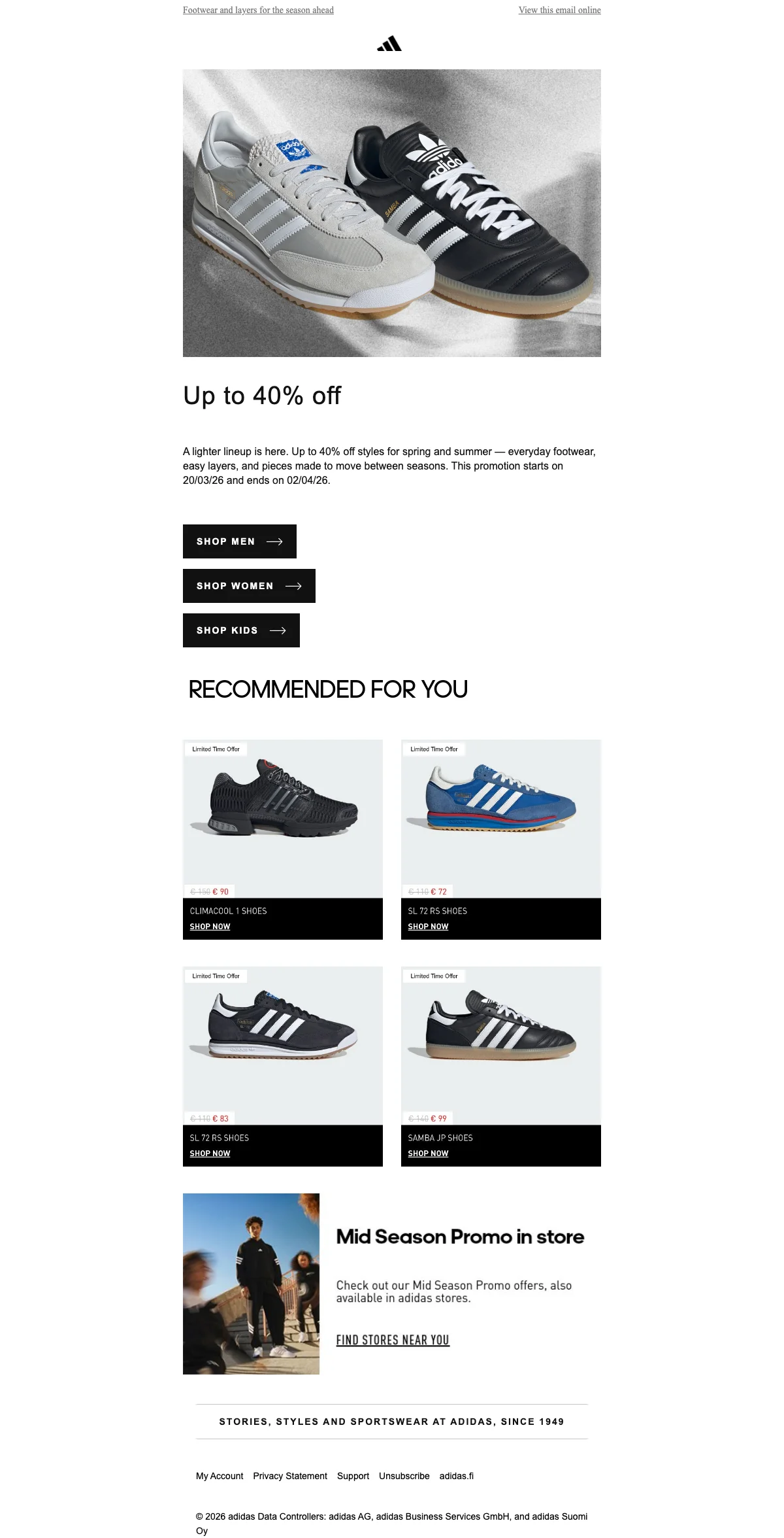 adidas ei ole koskaan tarjonnut alennuskoodeja. Seuraamme tätä kauppaa aktiivisesti ja ilmoitamme sinulle heti, kun koodeja on saatavilla. Löysitkö itse :n? Kerro siitä meille!