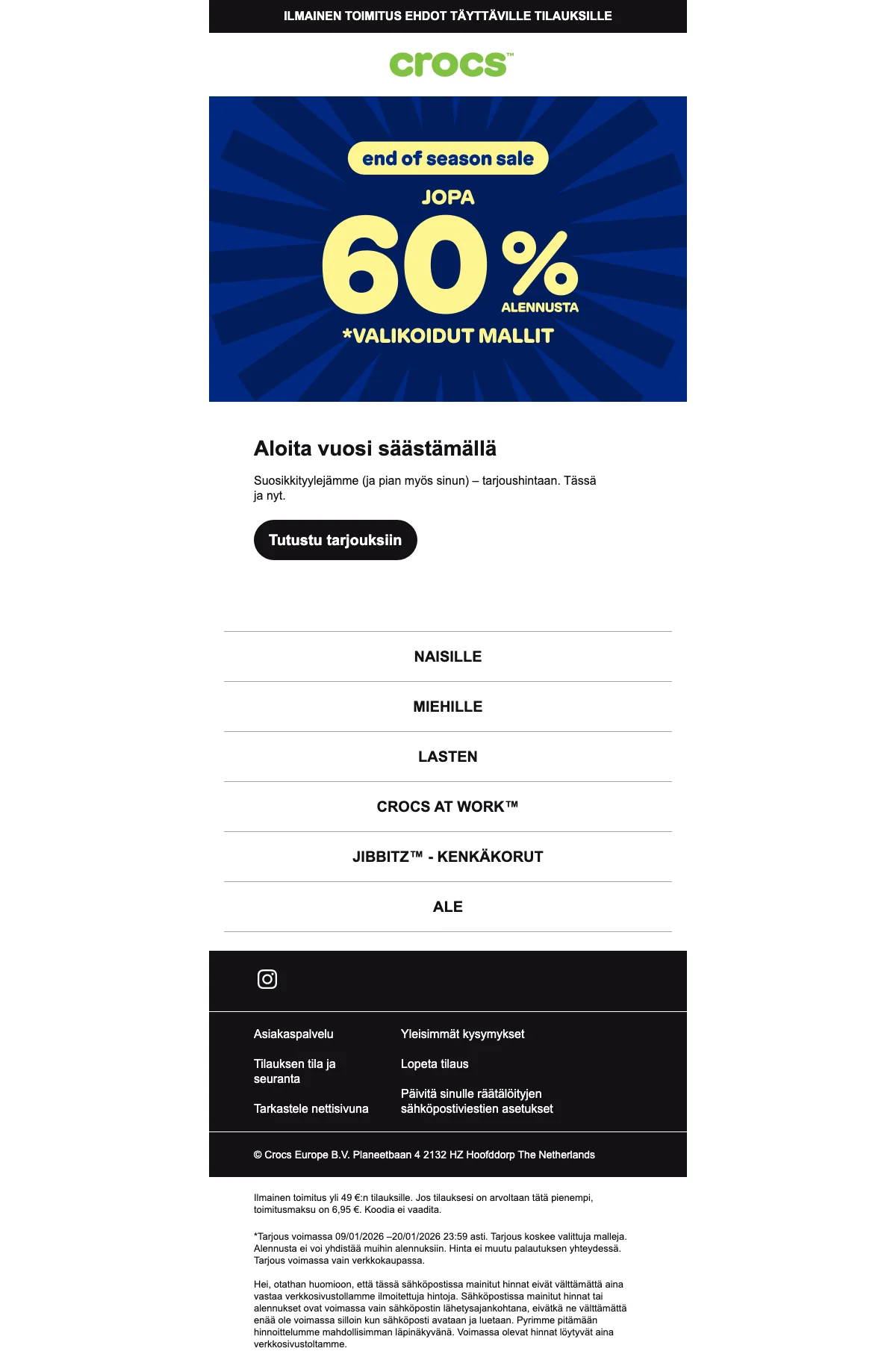Tilaa Crocsin uutiskirje pysyäksesi ajan tasalla ajankohtaisista alennuksista ja valikoimaan saapuvista uusista tuotteista. Saat tiedon uusista tarjouksista ensimmäisten joukossa, etkä menetä mahdollisuutta napata suosikkituotteita ennen kuin ne ovat kerenneet loppua varastosta. Uutiskirjeen tilaaminen ei sido tai velvoita sinua mihinkään ja sen lopetus hoituu nopeasti ja helposti vain parilla klikkauksella.