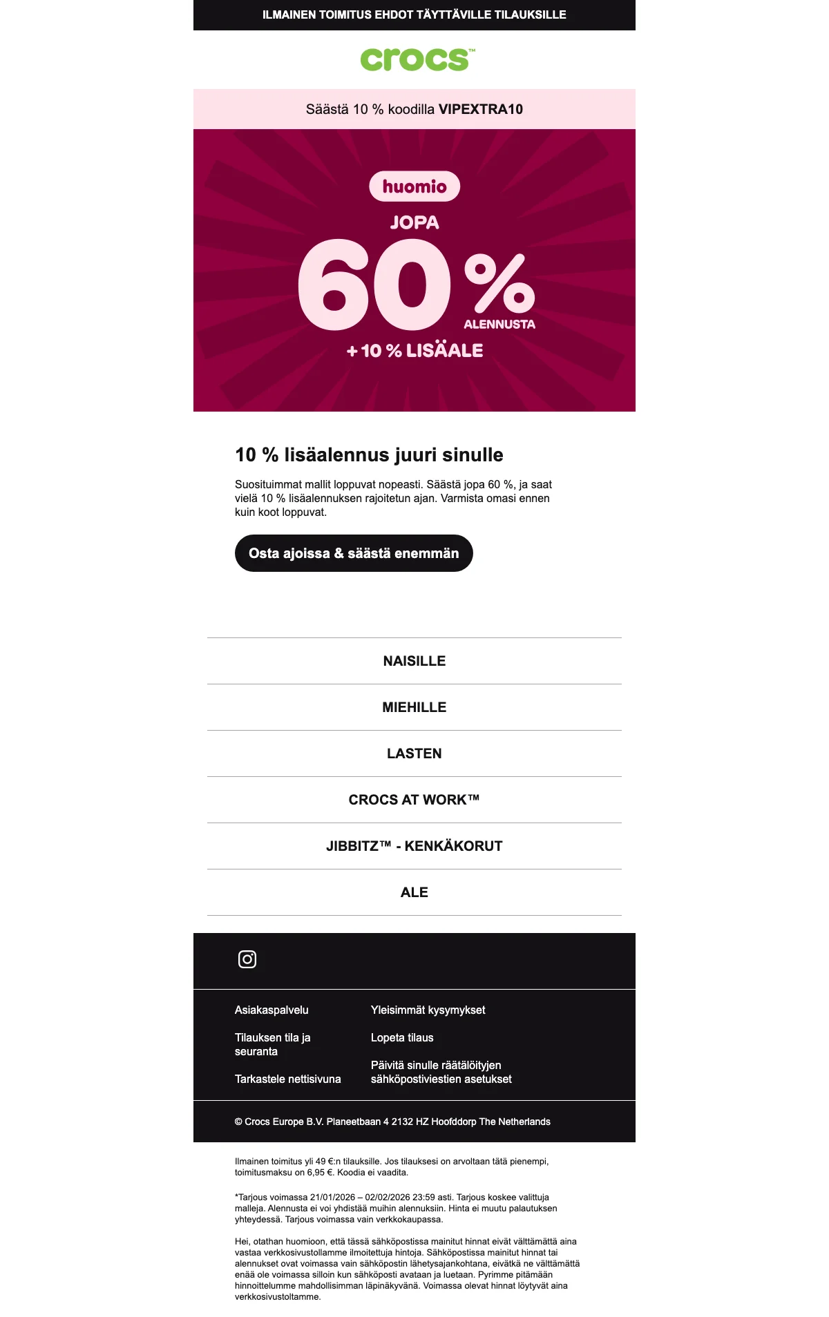 Alennuskoodit kaupalle Crocs ovat harvinaisia: viimeisten 6 kuukauden aikana vain yksi koodi oli saatavilla. Seuraamme kauppaa tarkasti ja ilmoitamme uusista koodeista. Löysitkö itse :n? Kerro siitä meille!