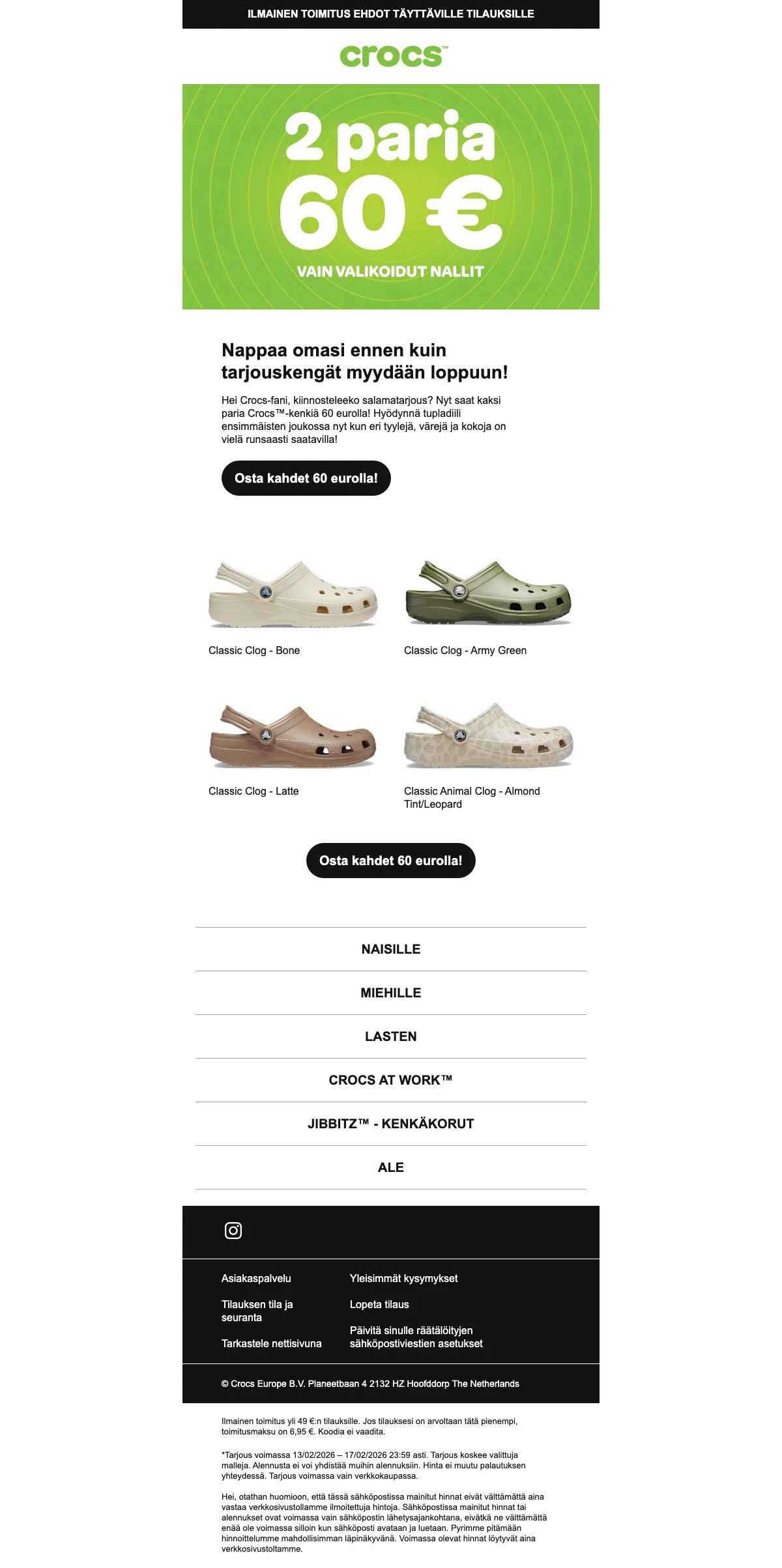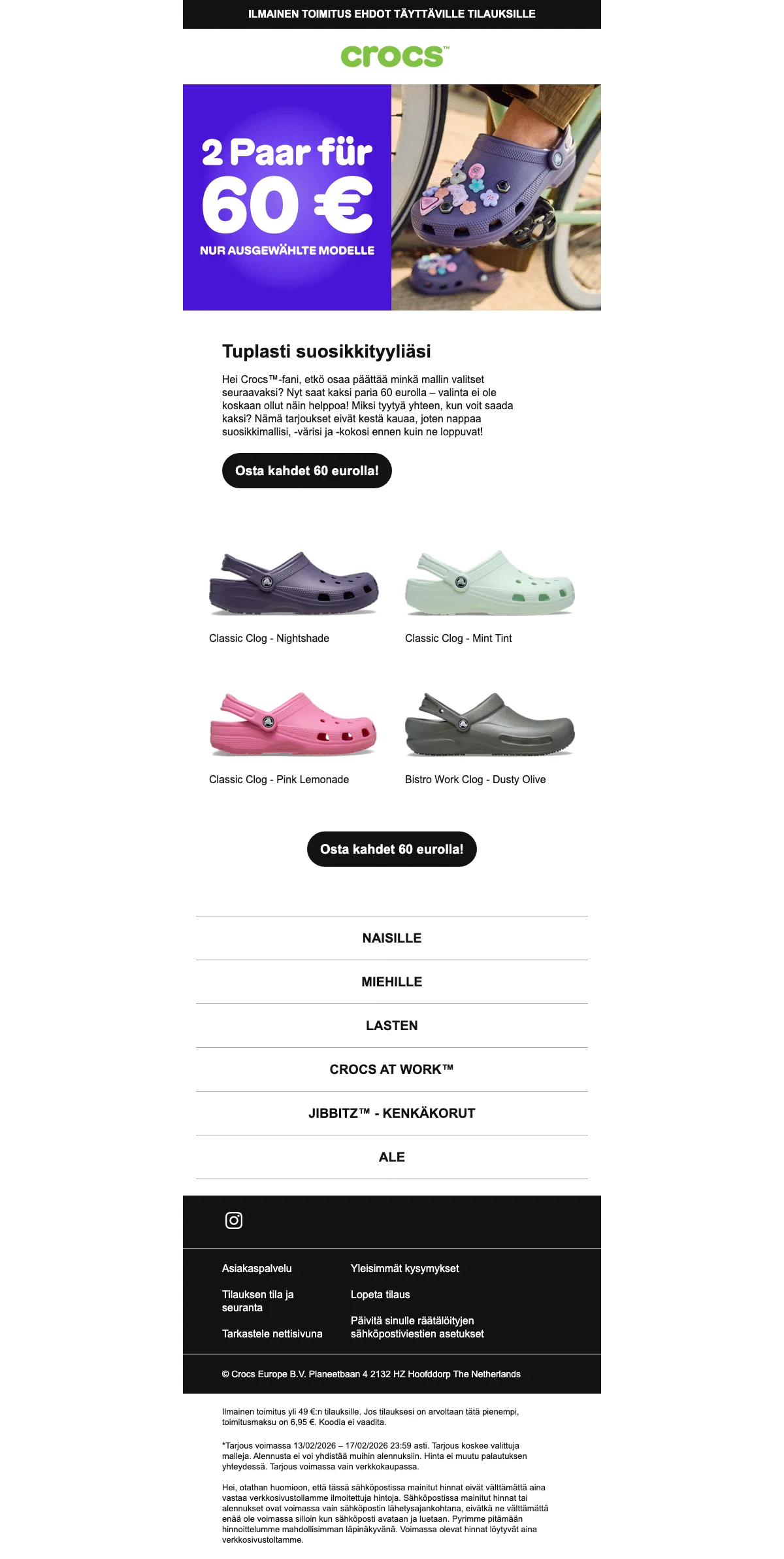 Osta kaksi paria valittuja Crocs-kenkiä yhteishintaan 60 €. Tarjous kattaa eri tyylit, värit ja koot naisille, miehille ja lapsille. Saat tupladiilin vain verkkokaupassa rajoitetun ajan.