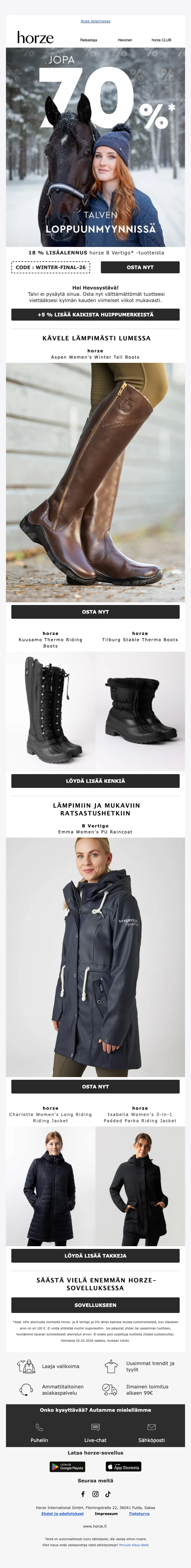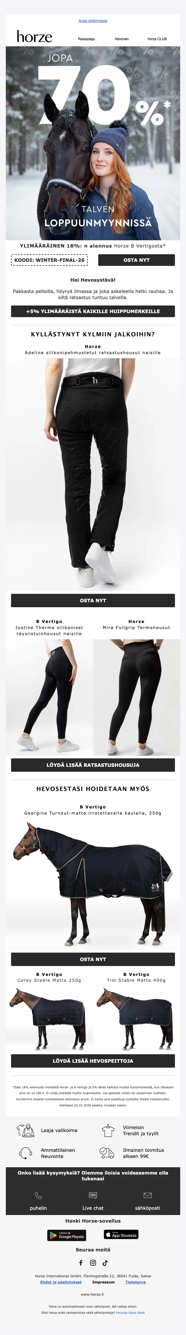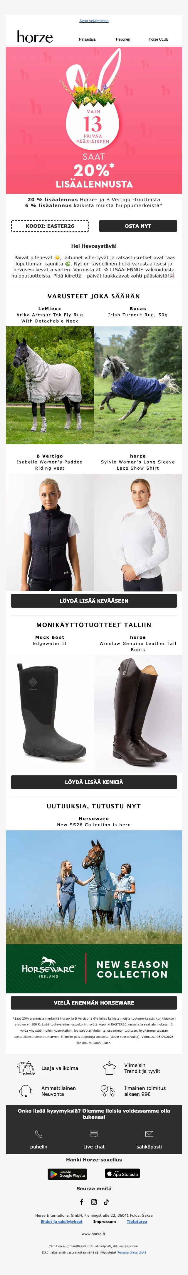 Verkkokaupan sivuilta löydät ajankohtaisimmat alennuskoodit, loistavat tarjoukset ja huikeat erikoiskampanjat sekä uutuustuotteista, että valikoimasta poistuvista tuotteista. Hyödynnä upea Horze alennuskoodi tai ainutlaatuinen tarjous ja takaat varmasti ratsastushousut, ratsastuskypärän tai hevostarvikkeet todella edullisin hinnoin. Uutiskirjeen tilaajat saavat lisäksi kaikki alekoodit ja tarjoukset suoraan sähköpostiin.