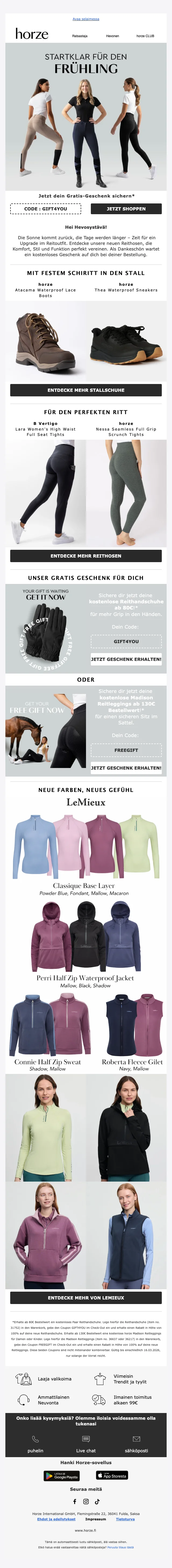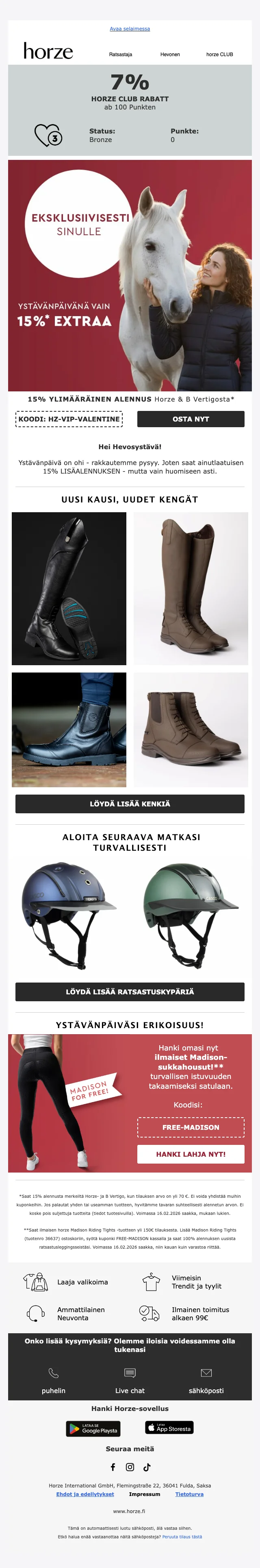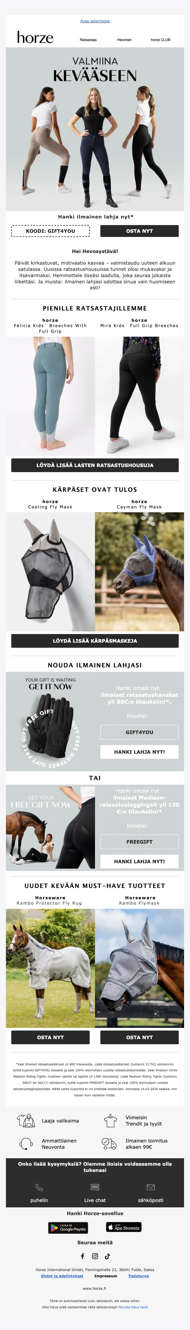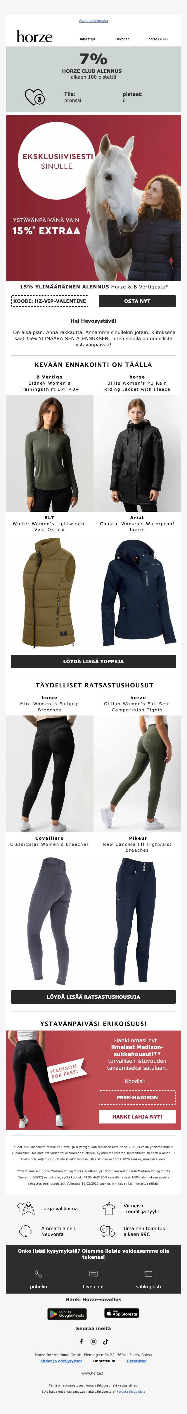 Verkkokaupan sivuilta löydät ajankohtaisimmat alennuskoodit, loistavat tarjoukset ja huikeat erikoiskampanjat sekä uutuustuotteista, että valikoimasta poistuvista tuotteista. Hyödynnä upea Horze alennuskoodi tai ainutlaatuinen tarjous ja takaat varmasti ratsastushousut, ratsastuskypärän tai hevostarvikkeet todella edullisin hinnoin. Uutiskirjeen tilaajat saavat lisäksi kaikki alekoodit ja tarjoukset suoraan sähköpostiin.