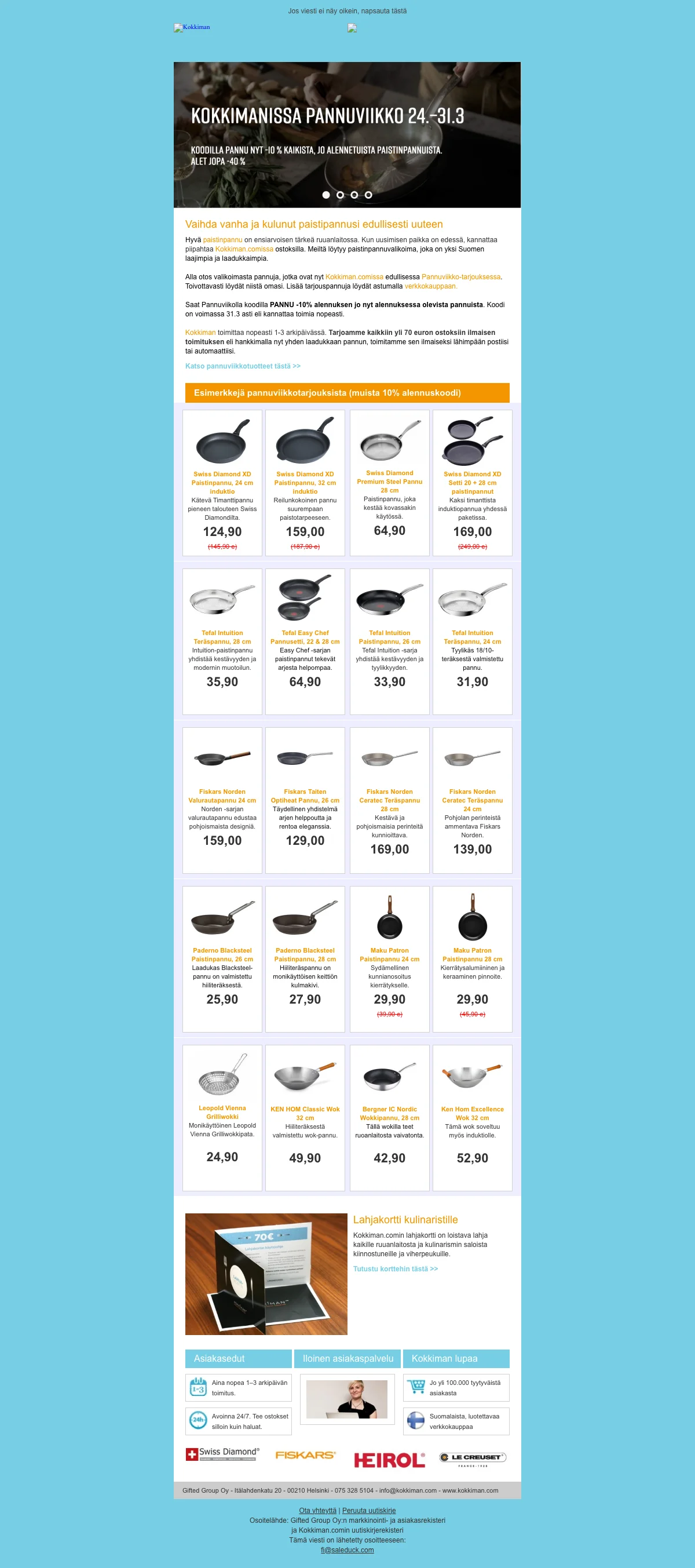 Outlet sivuston jatkuvien kampanjoiden lisäksi Kokkiman.com tarjoilee asiakkailleen vaihtuvia tarjouksia valituista tuotteista sekä erilaisia erikoiskampanjoita eri tuotemerkeille.