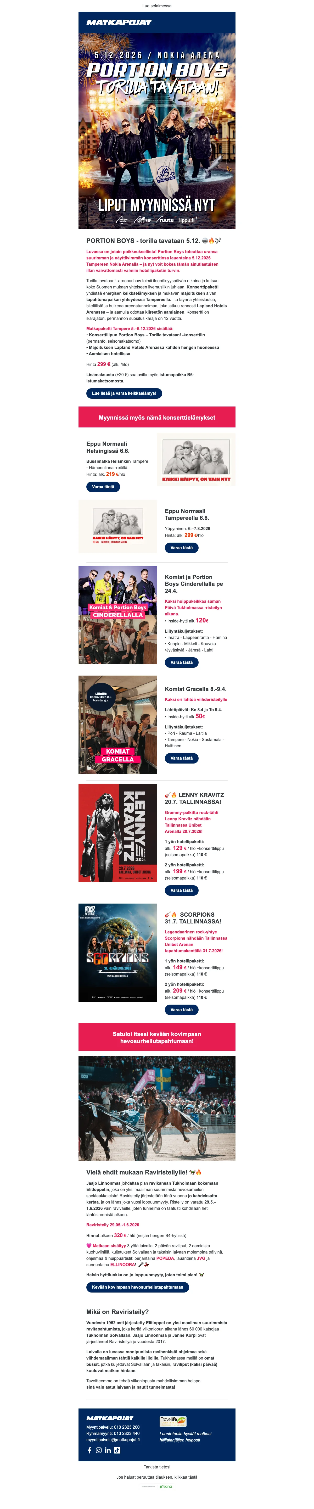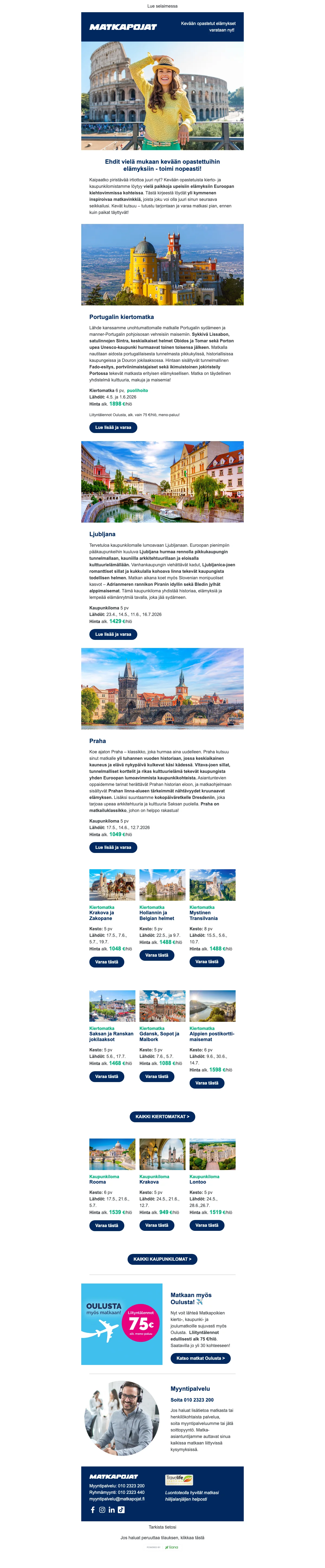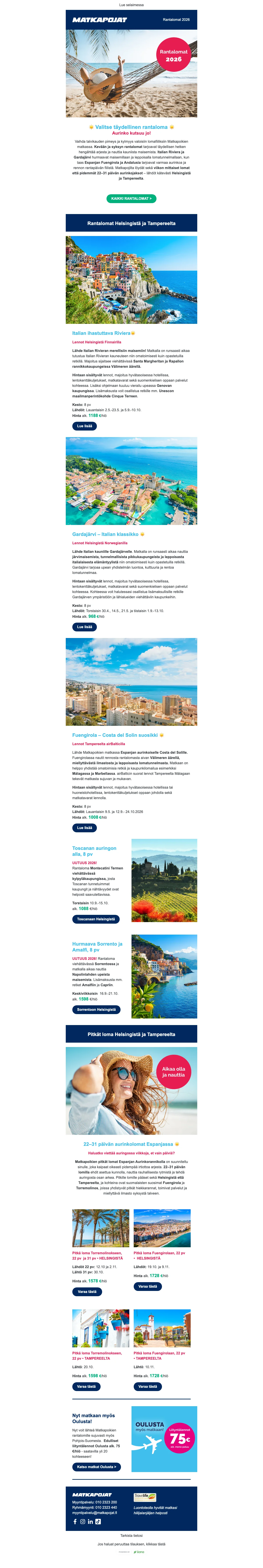 Puriko matkakärpänen? Kaipaatko piristystä kevääseen? Onko viimeisestä lomamatkastasi jo liian pitkä aika? Haaveilitpa sitten kahden viikon kiertomatkasta Euroopassa, elämysristeilystä Karibian kirkkailla vesillä tai pikapyrähdyksestä naapurimaihin, Matkapojat ovat mukana toteuttamassa unelmien lomaasi lähes 40 vuoden kokemuksella matkojen järjestämisestä. Nappaa Matkapojat tarjous ja varaa unelmien loma jopa puoleen hintaan. Halvat matkat toteutuvat helpommin kun tiedät mistä etsiä. Vertaa lennot, valitse parhaat hotellit, ota alle risteily tai varaa talven rantalomat. Kaikki onnistuu helposti ja edullisesti Matkapojat sivuston kautta.
