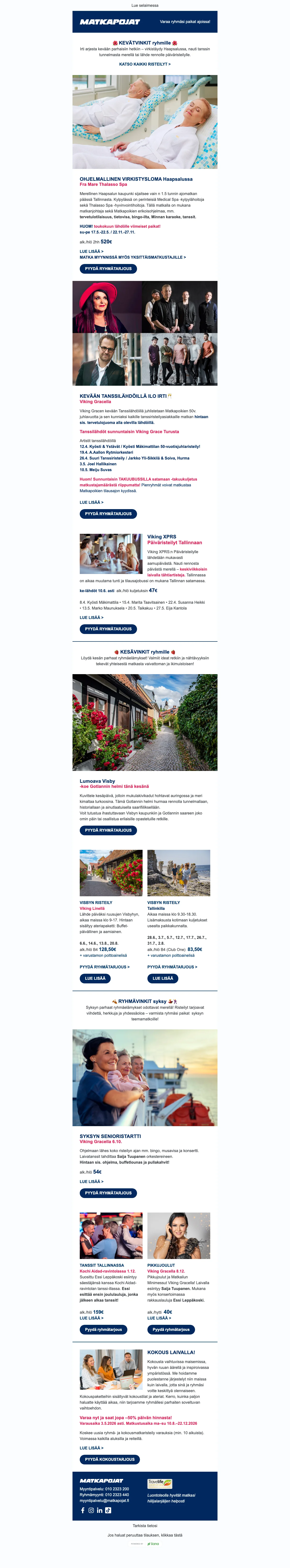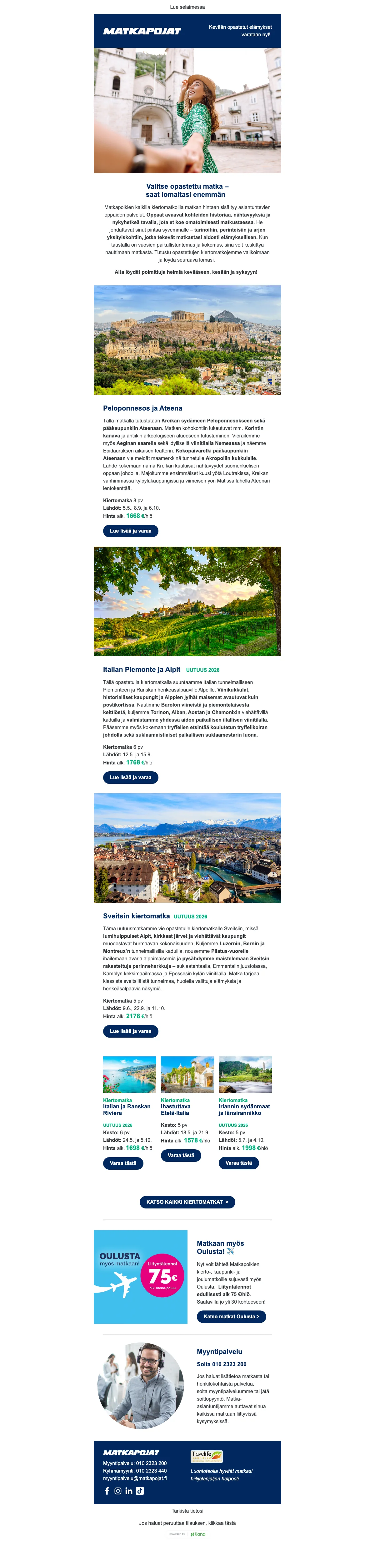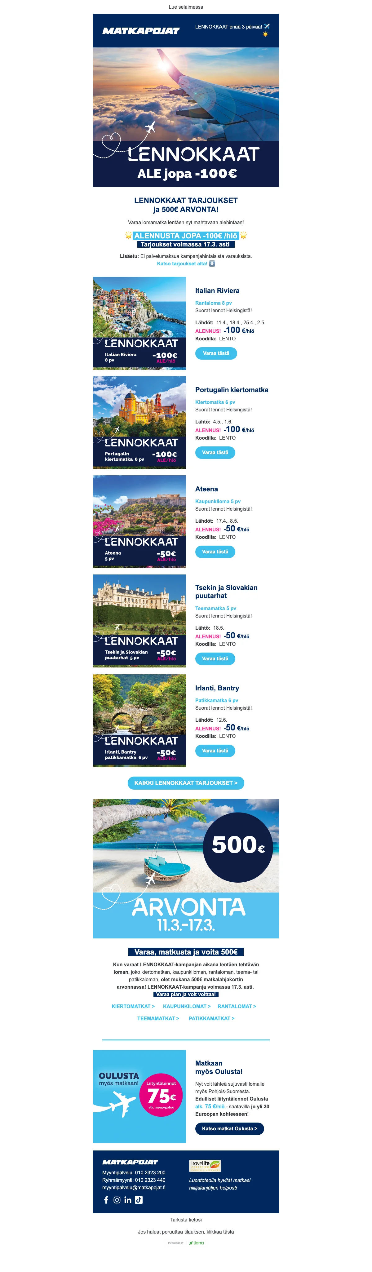 Puriko matkakärpänen? Kaipaatko piristystä kevääseen? Onko viimeisestä lomamatkastasi jo liian pitkä aika? Haaveilitpa sitten kahden viikon kiertomatkasta Euroopassa, elämysristeilystä Karibian kirkkailla vesillä tai pikapyrähdyksestä naapurimaihin, Matkapojat ovat mukana toteuttamassa unelmien lomaasi lähes 40 vuoden kokemuksella matkojen järjestämisestä. Nappaa Matkapojat tarjous ja varaa unelmien loma jopa puoleen hintaan. Halvat matkat toteutuvat helpommin kun tiedät mistä etsiä. Vertaa lennot, valitse parhaat hotellit, ota alle risteily tai varaa talven rantalomat. Kaikki onnistuu helposti ja edullisesti Matkapojat sivuston kautta.