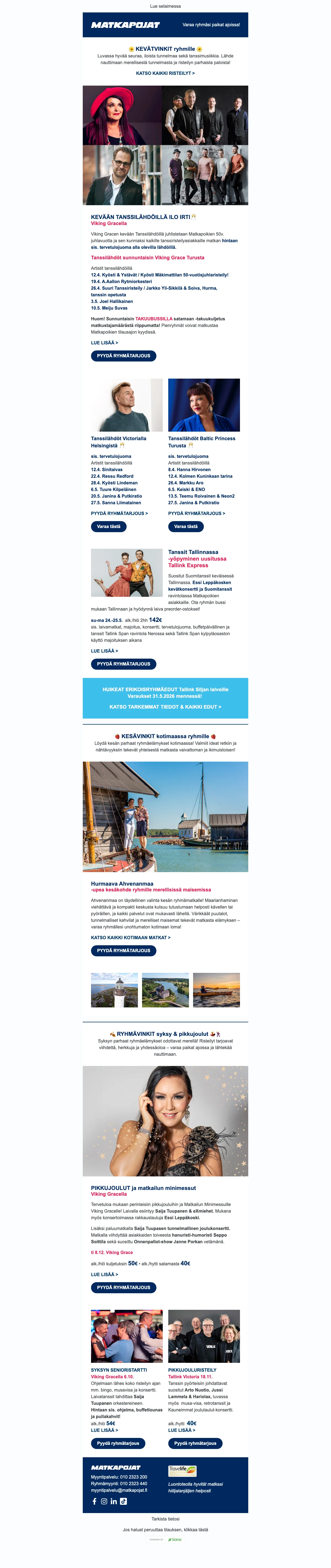 Matkapojat järjestävät risteilyt Tukholman lisäksi Maarianhaminaan, Pietariin ja jopa Uumajaan. Halutessasi kaukomaille tai hieman erilaisiin maisemiin, voit varata risteilyloman vaikkapa Tonavalle tai Karibian upeille saarille. Luonnollisesti suomalaisten suosikkikohde Tallinna on yksi Matkapojat risteilyiden suosituimmista vaihtoehdoista joten jos hakusessa on Matkapojat risteily, valitse Tallinna. Matkapojat risteilyt ovat suosittuja minilomia, joilla viihdyt! Alennuskoodi tai tarjous voi säästää vielä lisää jo ennestään edullisessa risteilyn hinnassa. Matkapojat tarjoukset takaavat sinulle jokainen päivä useita eri vaihtoehtoja laivamatkoille. Monet matkatoimistot eivät ikinä pääse yhtä edullisiin hintoihin kuin Matkapojat ja Ruotsin risteily saattaakin olla juuri se irtiotto arjesta mitä monet kaipaavat. Tarkista risteilyt Helsingistä tai vaikka Turusta ja lähde matkaan kohti laineita ja leppoista tunnelmaa.