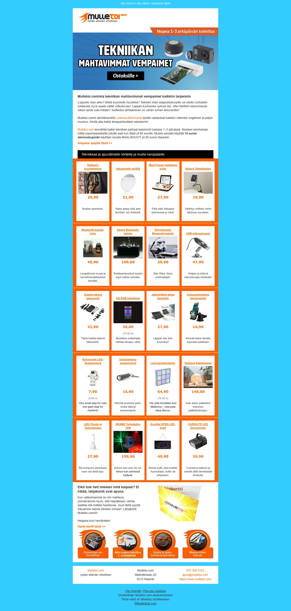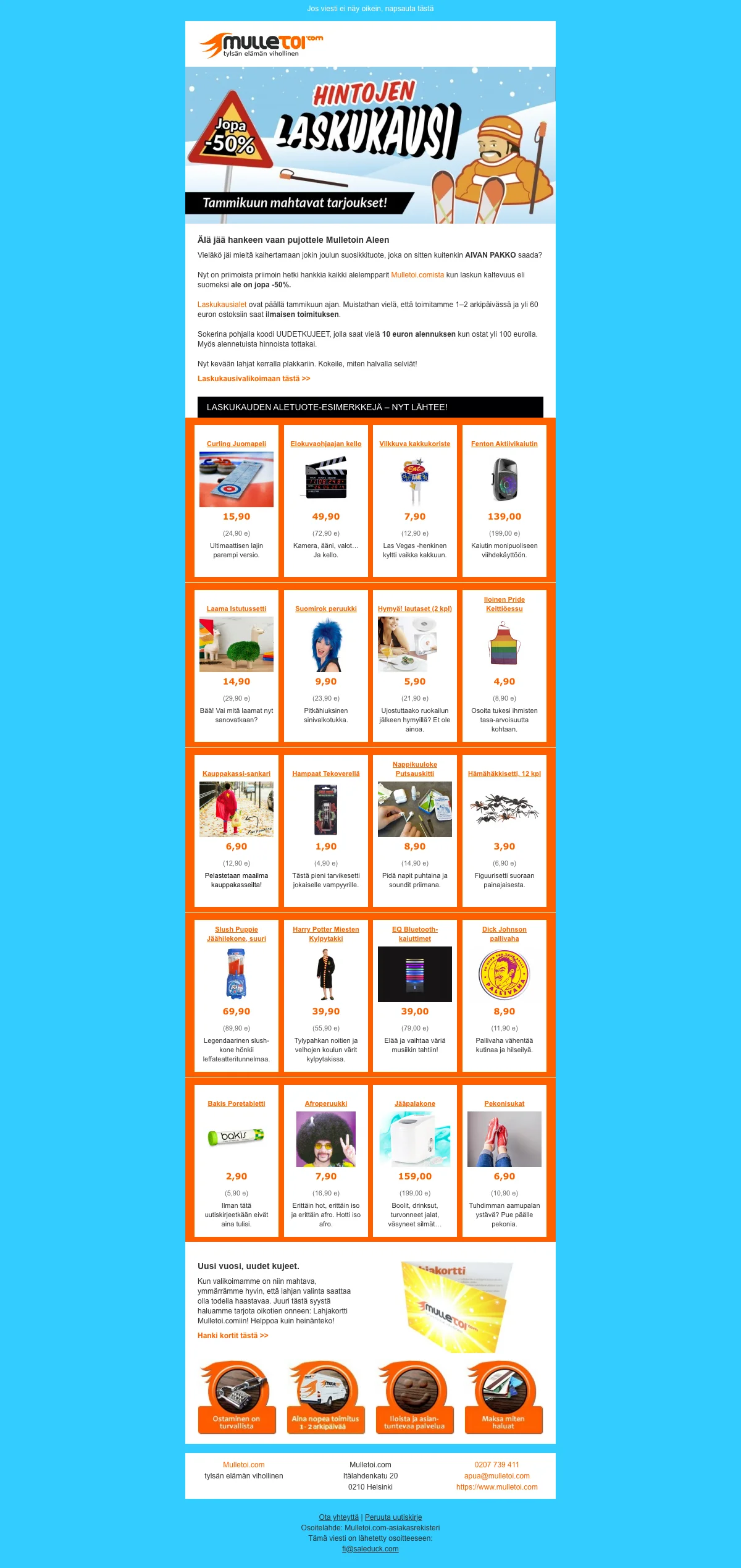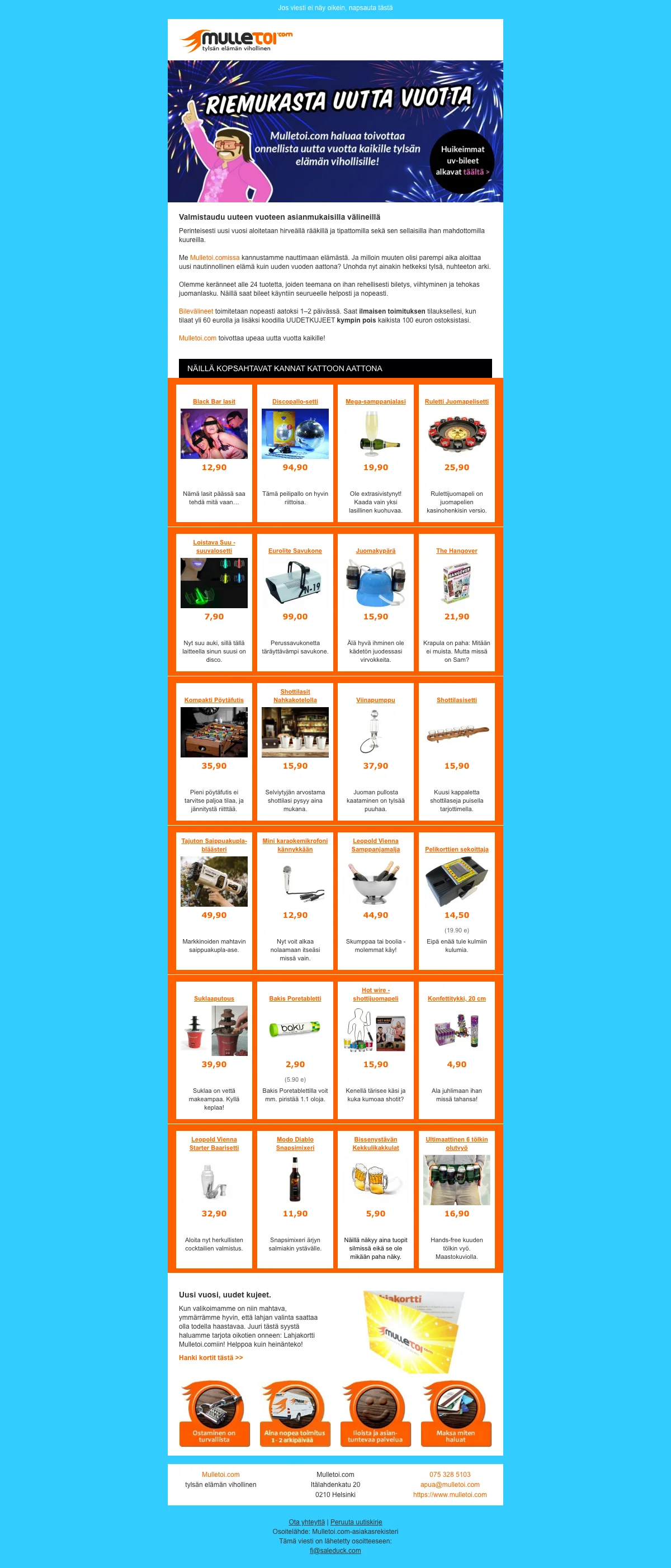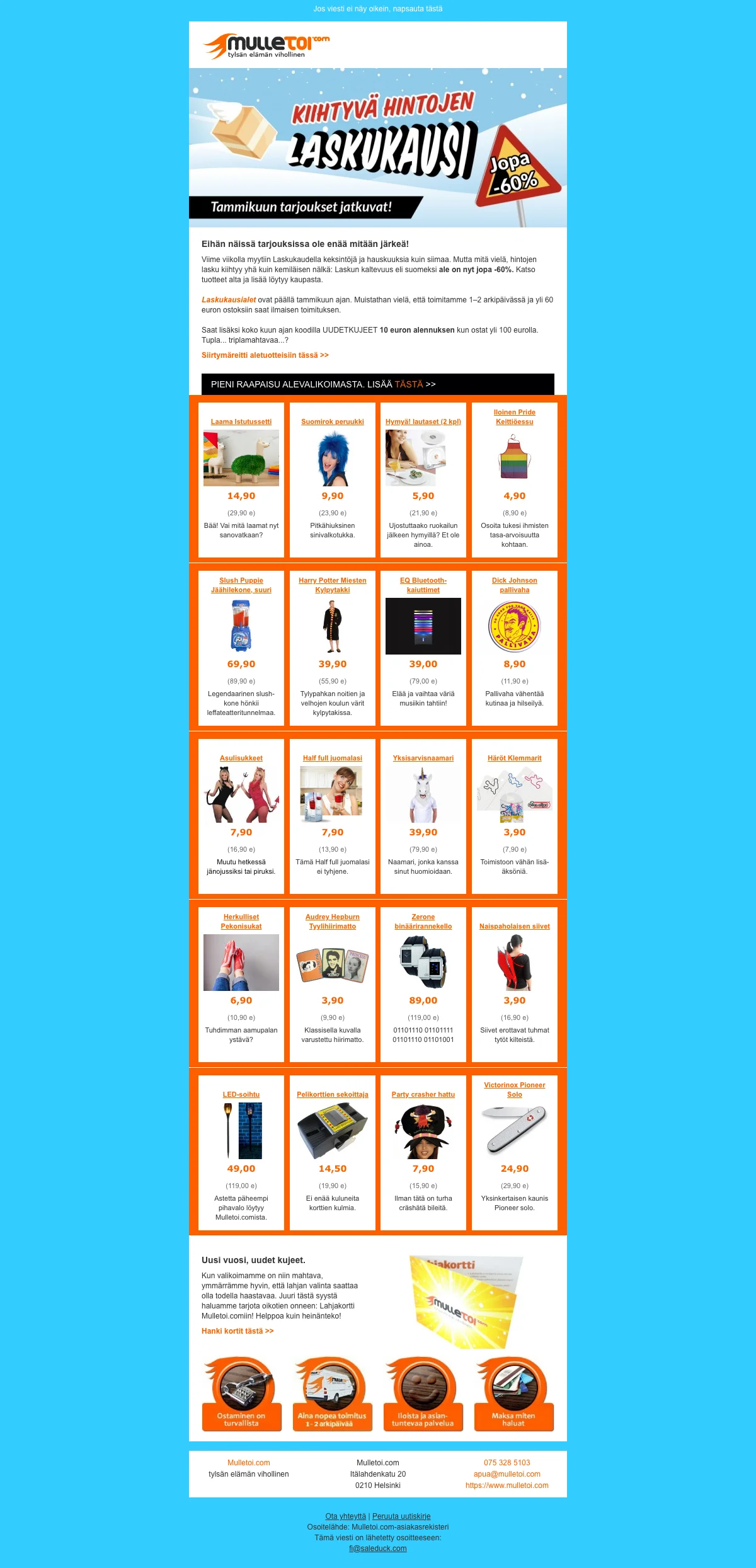 Tämä verkkokauppa tarjoaa asiakkailleen hauskanpitoa aina edulliseen hintaan. Tehdessäsi ostoksia yli 100 euron arvosta, saat 10 euron lahjakortin seuraavaa tilauskertaasi varten. Mulletoi alennuskuponki tekee ostoksistasi vieläkin edukkaampaa ja siksi sinun apunasi on Saleduck.
