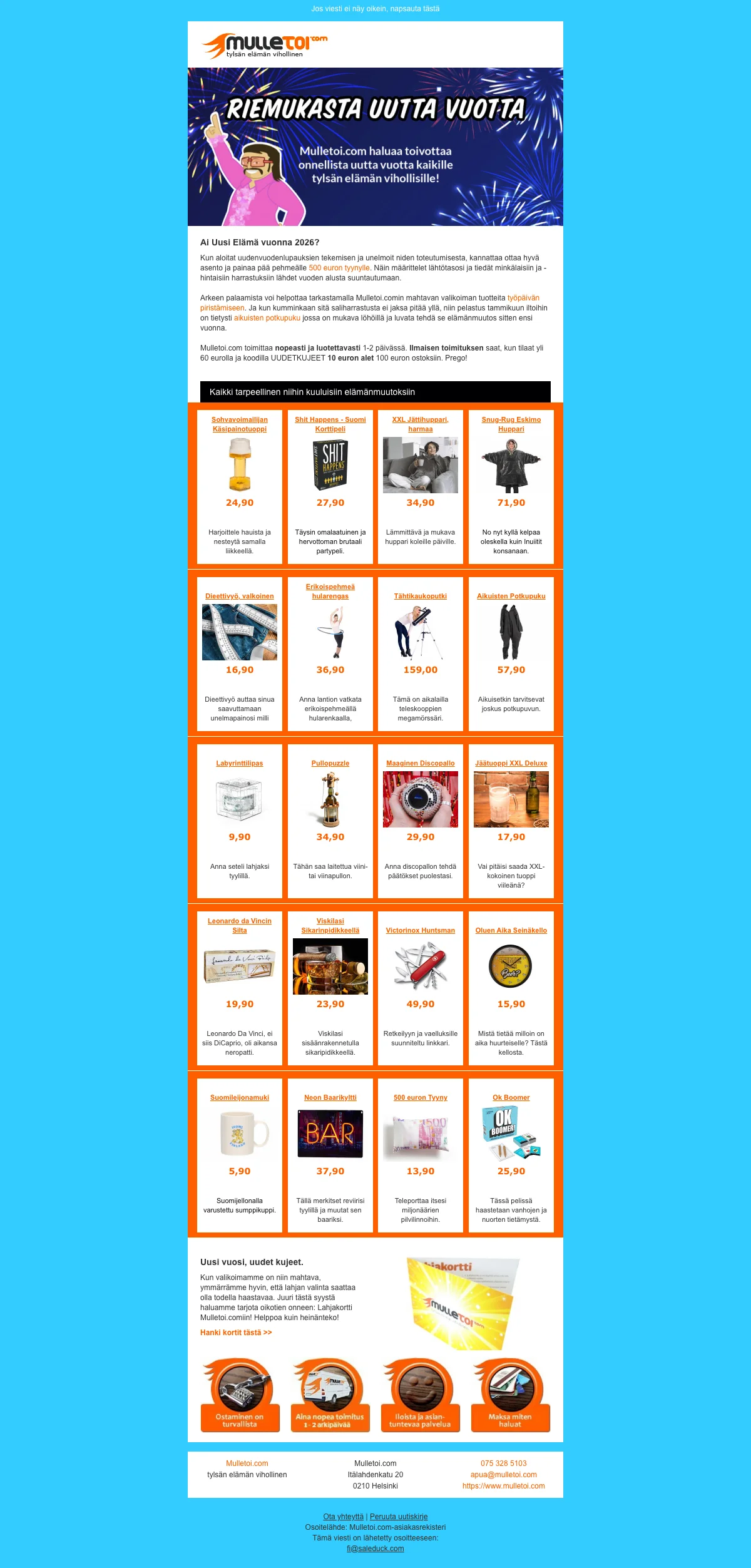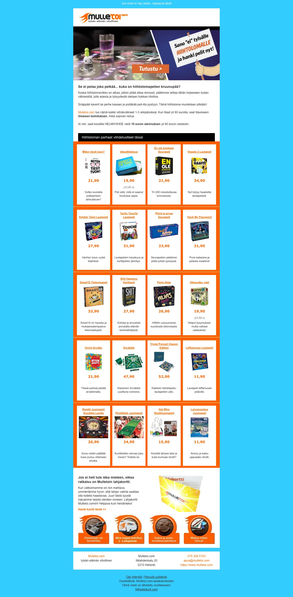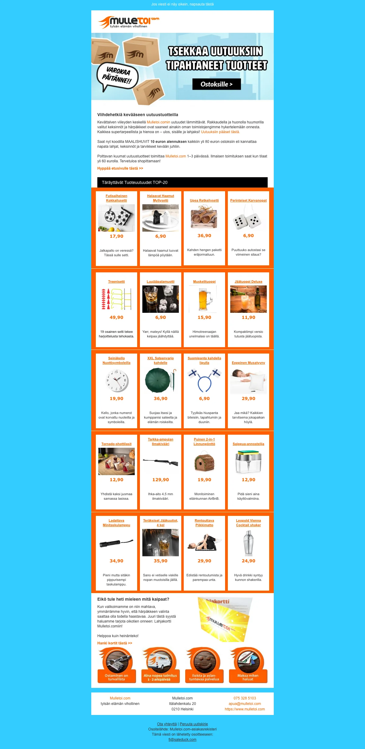 Mulletoi.com on internetissä toimiva verkkokauppa jonka perimmäinen tavoite on olla tylsän elämän pahin vihollinen. Kauppa tuo kaikkien saataville kiitettävän valikoiman erilaisia sisustustuotteita, tekniikkaa, juhlatarvikkeita, naamiaisasuja ,kodintarvikkeita, toimistotarvikkeita sekä seurapelejä. Mulletoi.fi eroaa muista internetin tavarataloista sillä, että kaikki sen tarjoamat tuotteet on varustettu runsaalla ripauksella huumoria ja hauskanpitoa. Jos siis rakastat jekuttaa muita, hassutella juhlissa tai vapaa-ajalla ja pelata hämmentävän hauskoja seurapelejä, tulet rakastamaan verkkokaupan valikoimaa. Poskettomat toimistotarvikkeet piristävät arkeasi myös toimistolla, joten elämäsi voi olla yhtä hymyä "kotoo töihin".