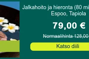 Terveys on jokaiselle tärkeä asia. Siksi sen ei tulisi maksaa maltaita. Sivusto mahdollistaa terveydestä huolehtimisen hyvään hintaan. Varaa klassinen hieronta, akupunktio, tai esimerkiksi kuumakivihieronta yli 50% alennuksella. Hanki lisäksi luontaistuotteet edistämään terveellisiä elämäntapoja. Hieronta on helppo tapa pitää kroppa kunnossa, joten hyödynnä muun muassa erinomaiset kylpylälomatarjoukset ja hemmottele itsesi piloille hieronnoissa ja porealtaissa. Tutustu lukuisien tarjousten kirjoon ja hyödynnä esimerkiksi uskomaton Flamingo Spa -tarjous, jolla saat kylpyläloman koko perheelle yli puolet halvemmalla hinnalla. Toimi heti ja lunasta itsellesi paras kylpylätarjous netistä jo tänään!