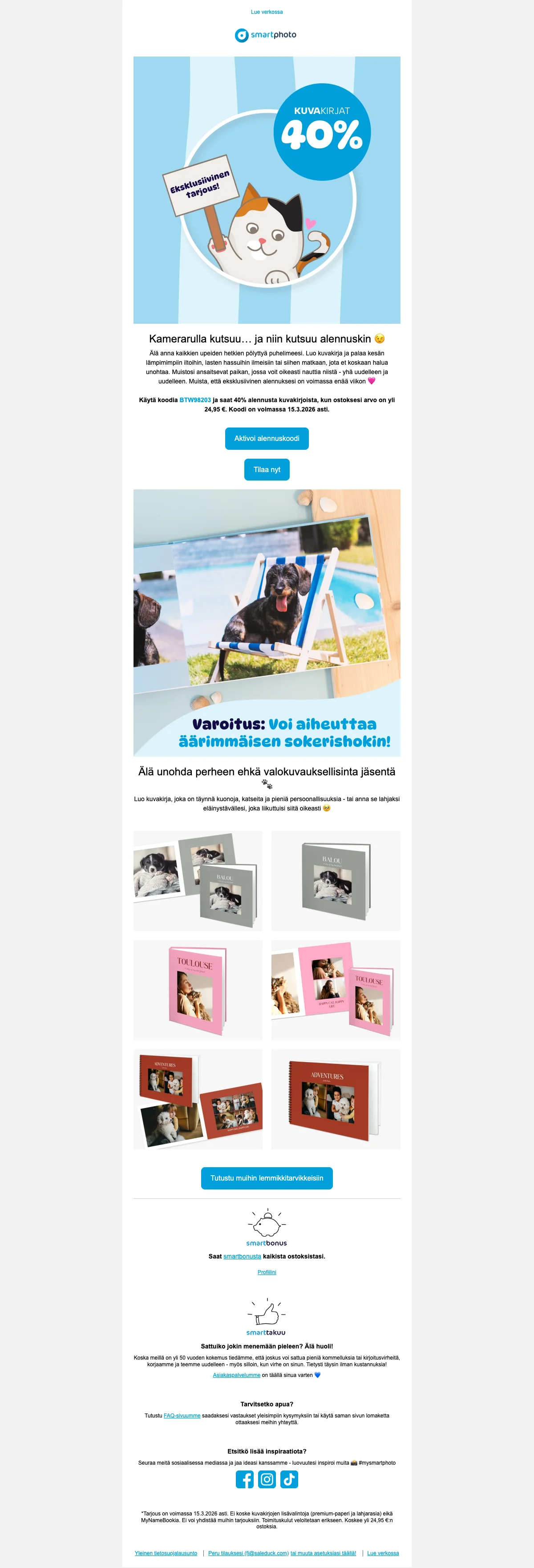 Smartphoto alennuskoodi: kuvakirjat 40% alennus yli 24,95 €