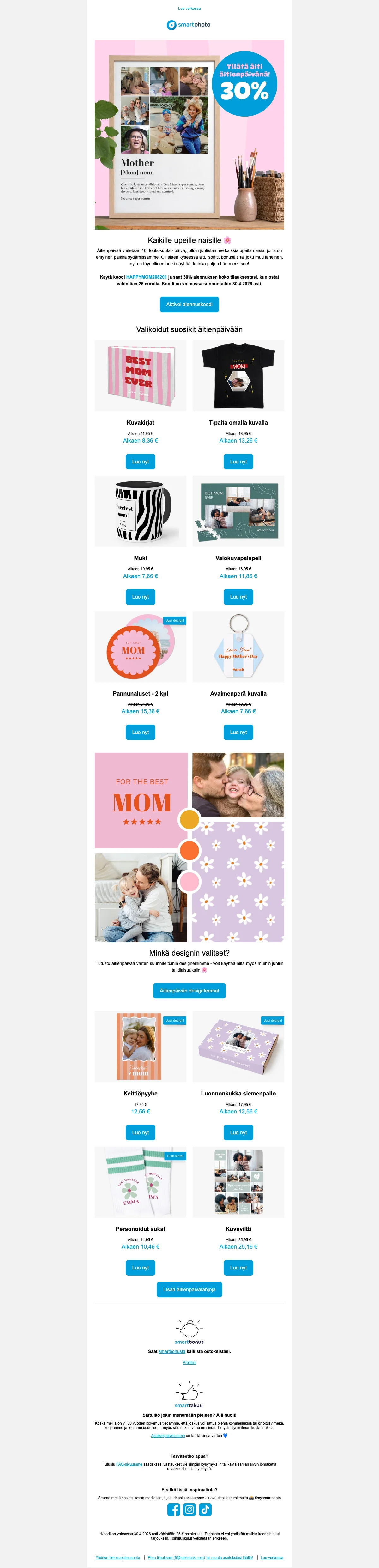 | SU21HP1 | Smartphoto alennuskoodi - Kaikki kuvakirjat, canvas-taulut ja kuvakortit 30% alessa |