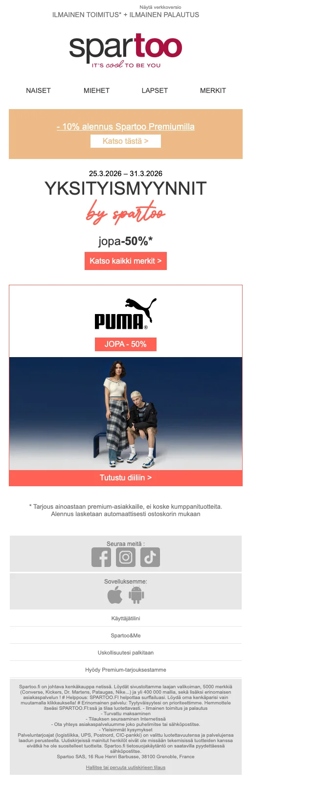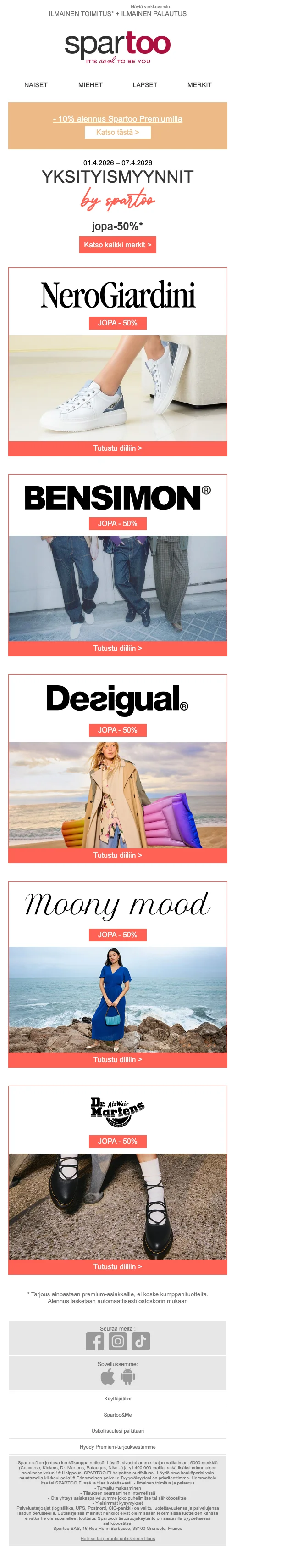 Saat jopa -50% alennusta merkeistä Camper, Vans, Skechers, adidas ja Victoria sekä ilmainen toimitus ja palautus. Alennus lisätään automaattisesti ostoskoriin ja kampanja koskee premium-asiakkaita.