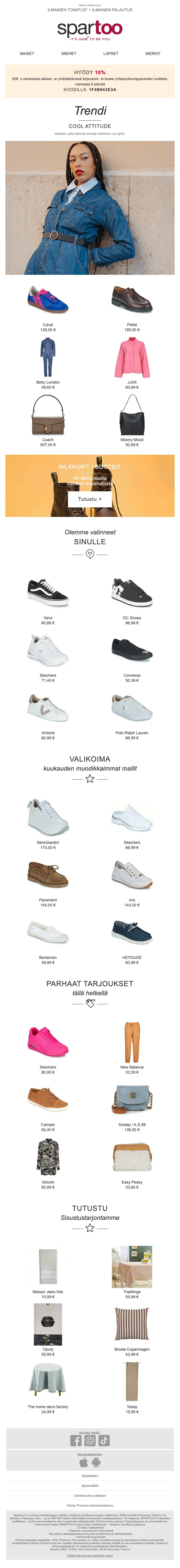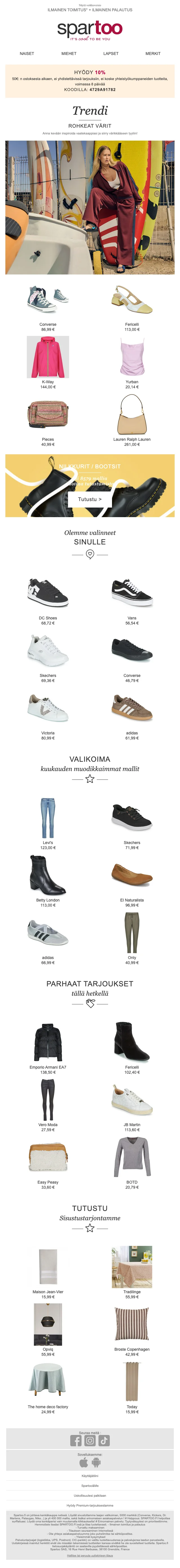 Spartoo alennuskoodi on eb6344fe78. Syötä koodimme Spartoo 2026 kassalla ja lunasta eksklusiivisia alennuksia. Spartoo ilmainen toimitus ja 10% alennus yli 50€ ostoksista.