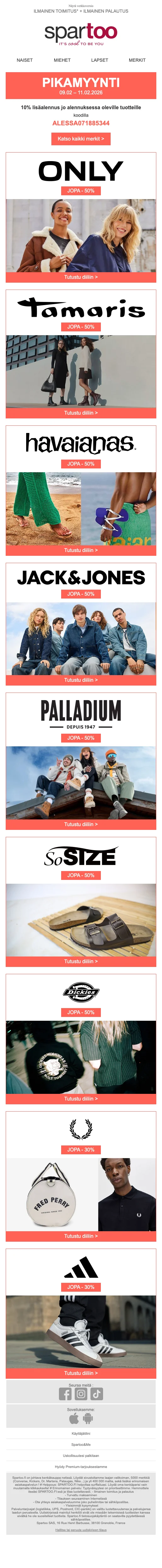 Maija, 🔔 Huipputarjouksia ja ilmainen toimitus : jopa -50% ja 10% lisäalennus merkeissä Only, Tamaris, Havaianas, Jack & Jones, Palladium, So Size, Dickies, Fred Perry ja adidas: Flash-myynti Spartoolla!
