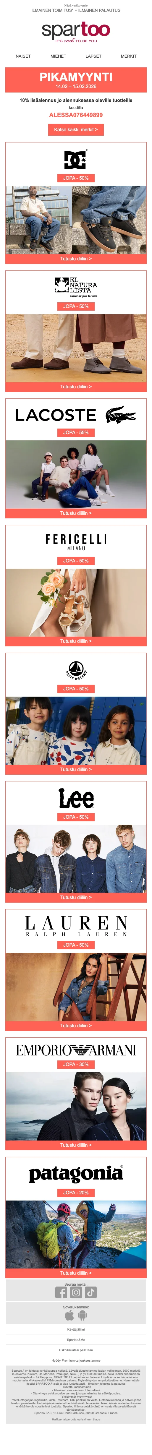 Maija, 💨 Nopeasti : Jopa -55% ja 10% lisäalennus merkeissä DC Shoes, El Naturalista, Lacoste, Fericelli, Petit Bateau, Lee, Lauren Ralph Lauren, Emporio Armani ja Patagonia: Flash-myynti ilmaisella toimituksella!
