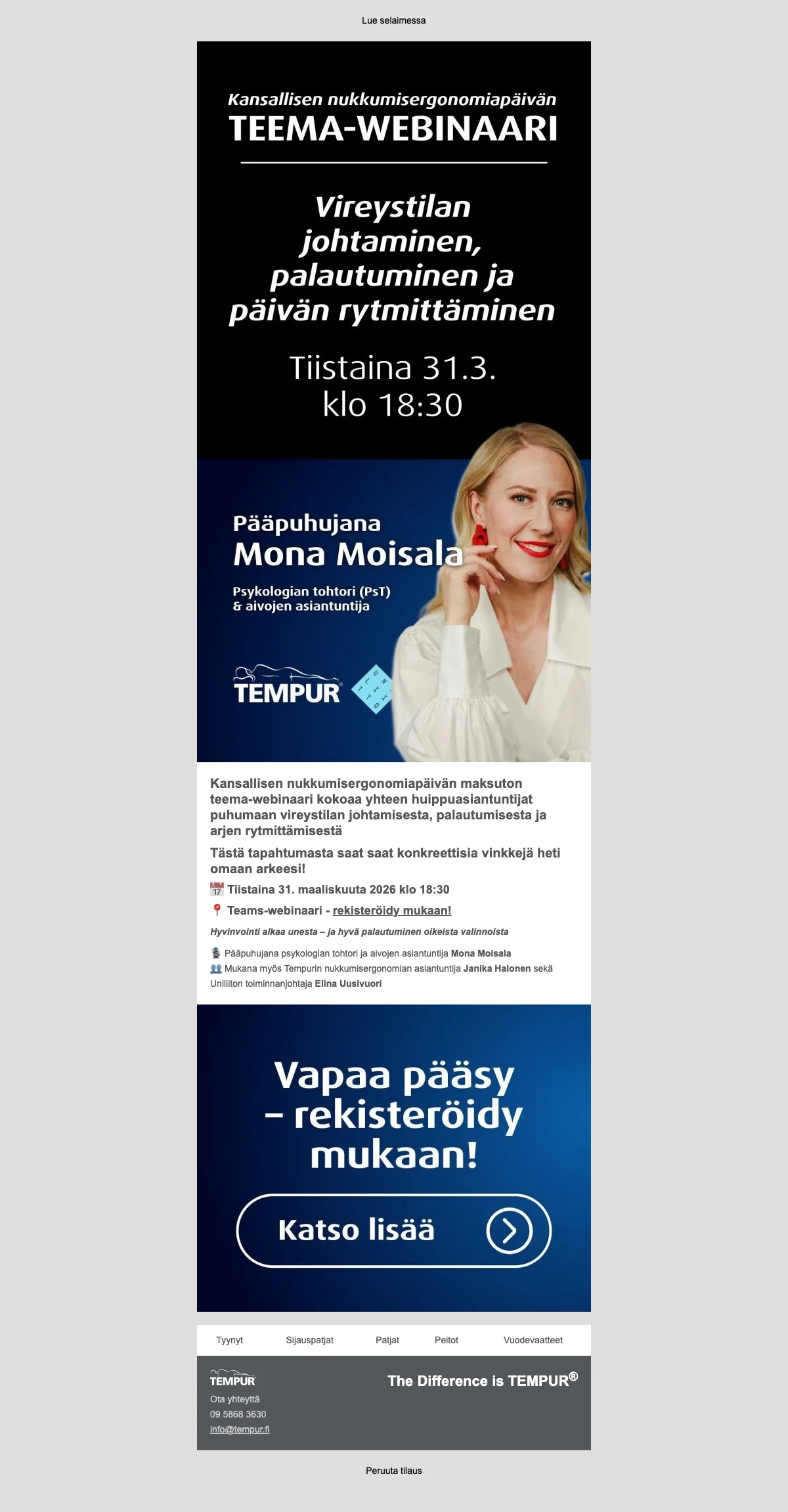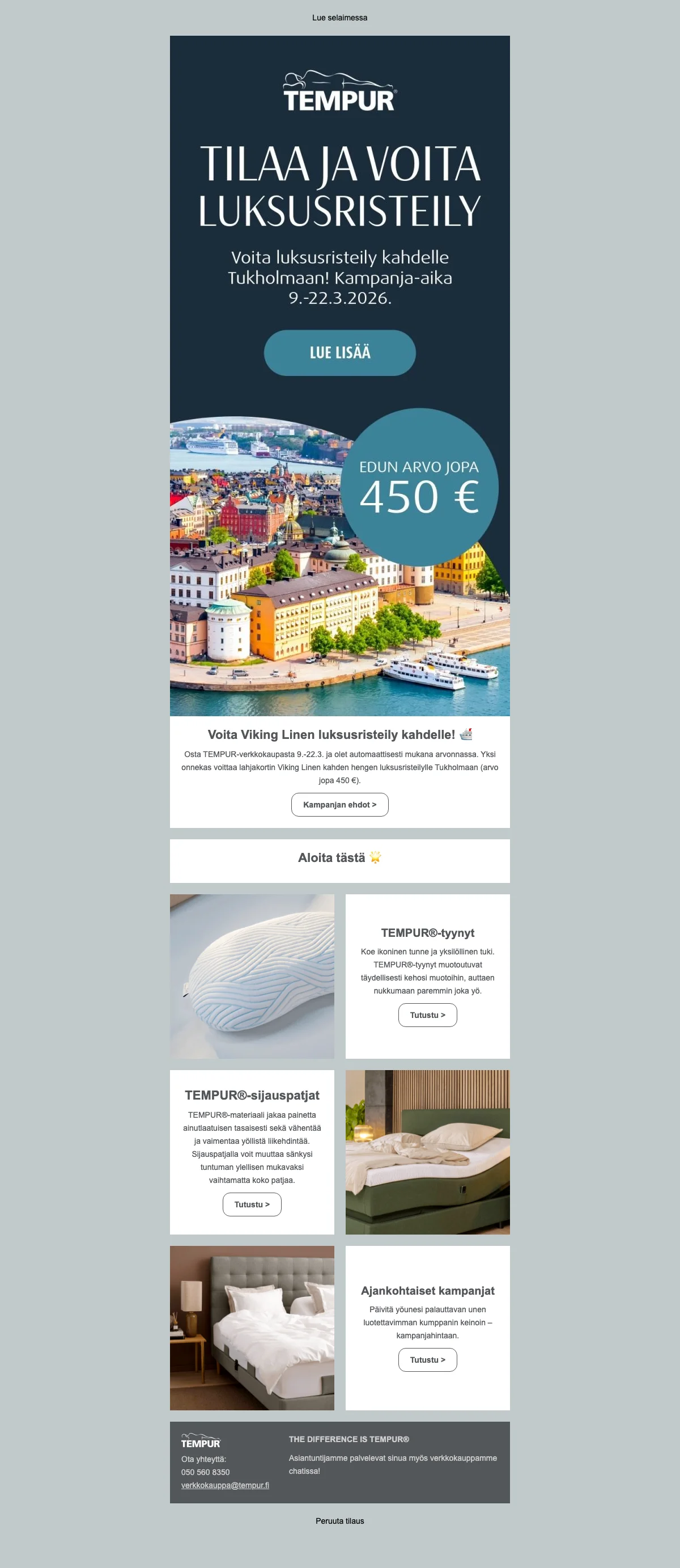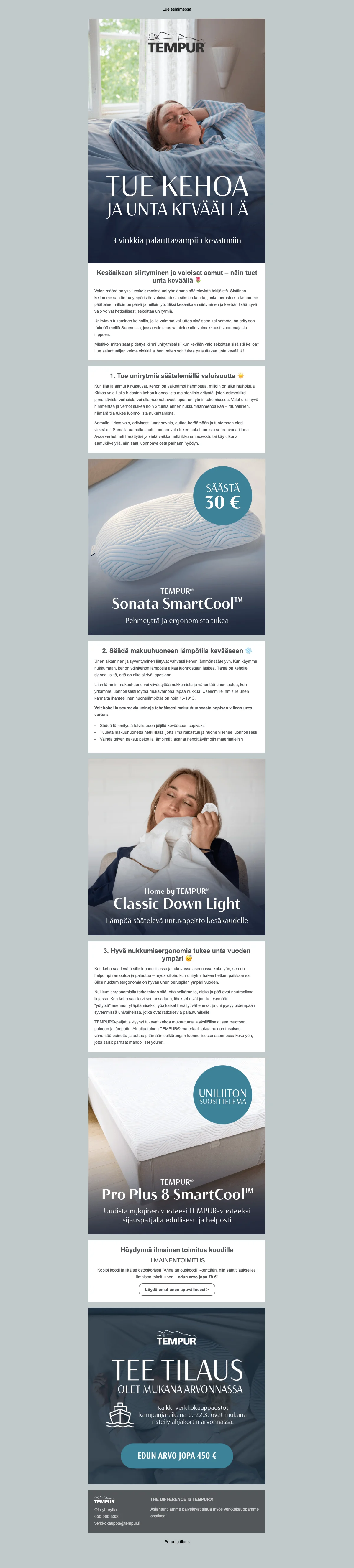 Nauti 25% alennuksesta TEMPUR-patjoista ja tyynyistä, jotka on valmistettu NASA:n tunnustaman teknologian mukaisesti. TEMPUR-tuotteet tarjoavat yksilöllisen mukautuvuuden ja parantavat unen laatua.