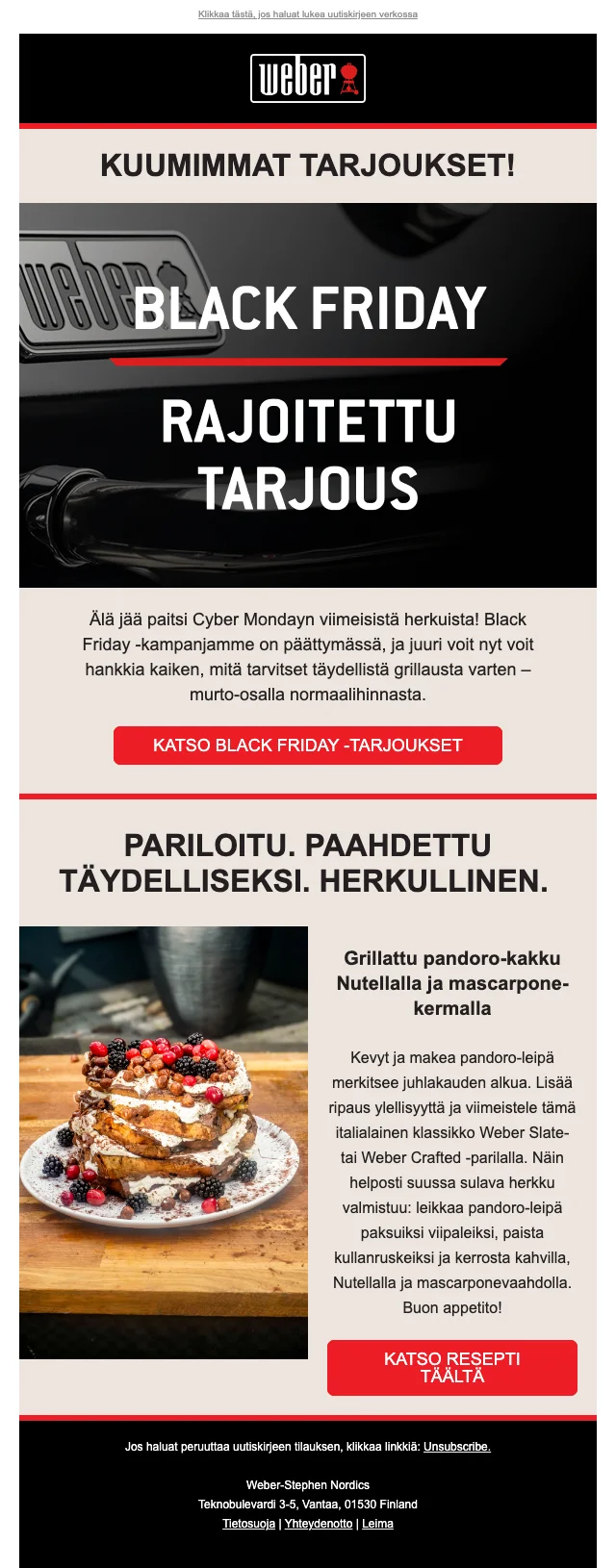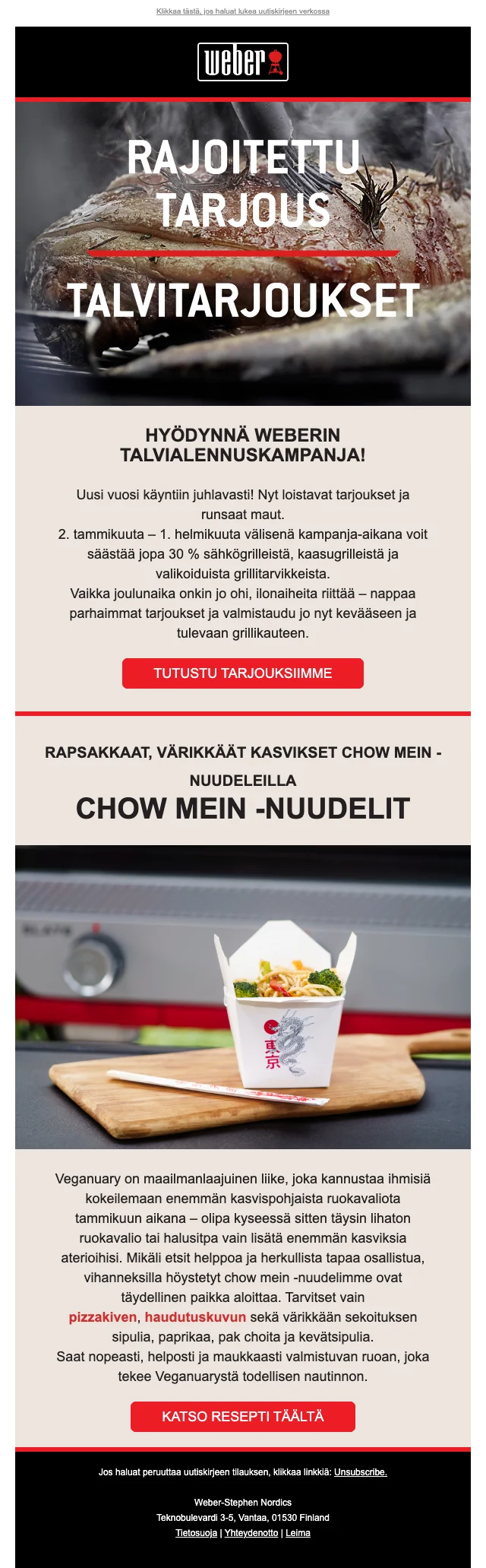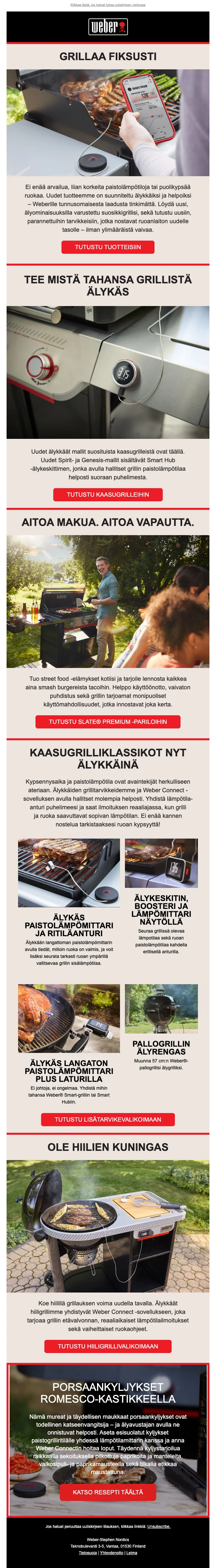 Nyt on loistava tilaisuus päivittää grillisi! Saat 20% alennuksen kaikista grilleistä ja tarvikkeista Weberin outlet-myymälässä. Kesä tulee, joten valmistaudu grillaamaan parhaat ateriat ystävien ja perheen kanssa.